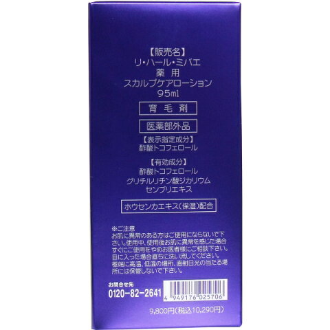 商品特徴一覧haircare、ikumou、4949176025706、通信販売、通販、販売、買う、購入、お店、売っている、ショッピング【リ・ハール・ミバエ 薬用育毛剤 95mL】広告文責(有)イースクエアTEL:0120-532-772株式会社東京企画販売個装サイズ:58X125X58mm個装重量:約210g内容量:985mL【発売元:東京企画販売】【医薬部外品】【効能・効果】育毛、毛生促進、発毛促進、薄毛・脱毛の予防【有効成分】酢酸トコフェロール、グリチルリチン酸ジカリウム、センブリエキス【使用方法】(1)ご使用前は、洗髪してドライヤー等で髪をよく乾かし、ご使用ください。